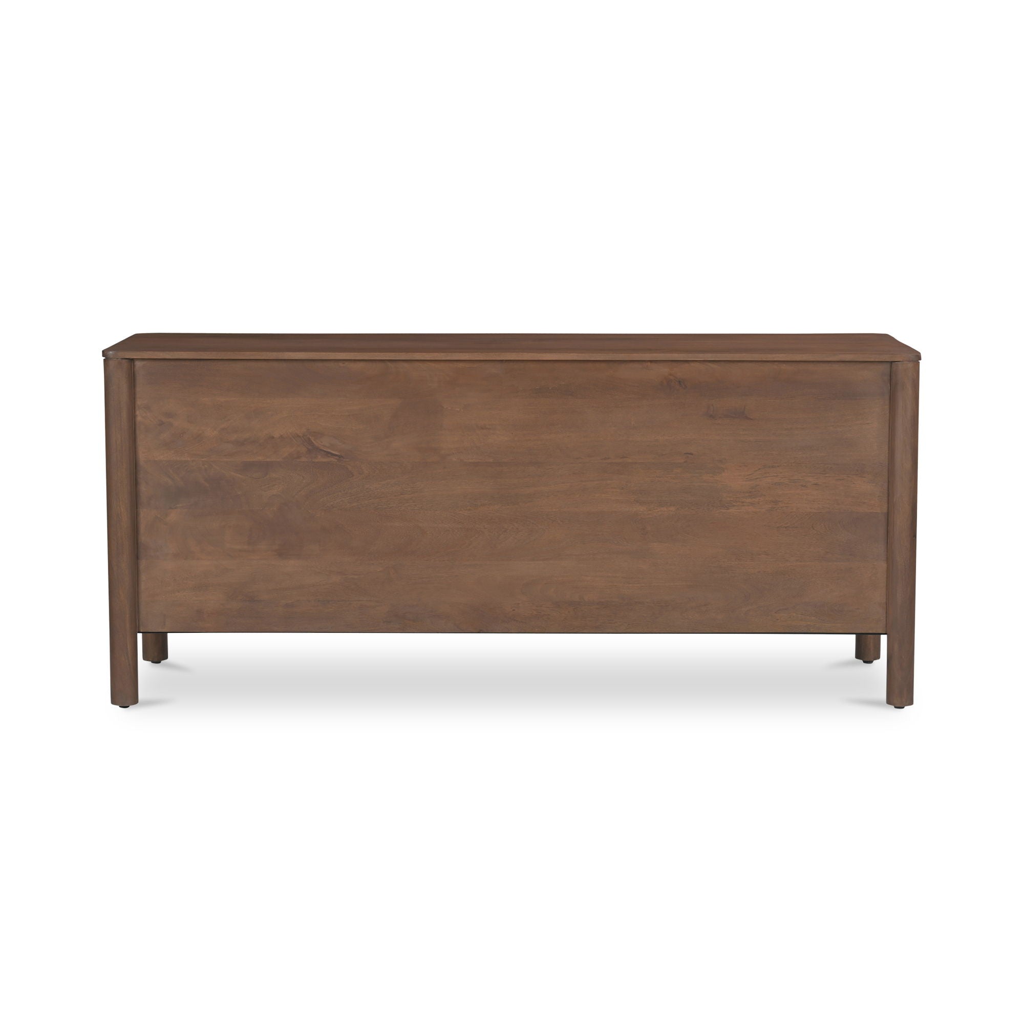 Modern aesthetics effortlessly blend with the refined simplicity of traditional Shaker design in the Wiley 4 door sideboard. Meticulously crafted, its elegant form is defined by sleek, geometric curves that add a captivating touch of modernity. The post legs stand as pillars of strength, grounding the sideboard with their understated presence. A showcase of intricate scalloped edge details and heavy brass handles, these delicate elements lend a timeless charm reminiscent of classical influences.